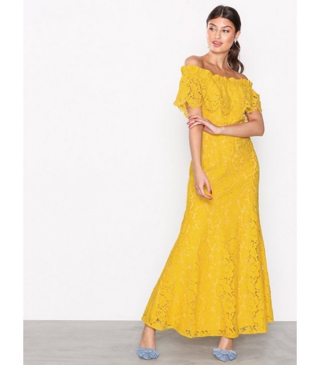 Lace dress from By B'mart Long, off-shoulder design with defined waist. Elastic and frilling around shoulders. Hidden zipper and hook closure at back. Hand wash recommended.