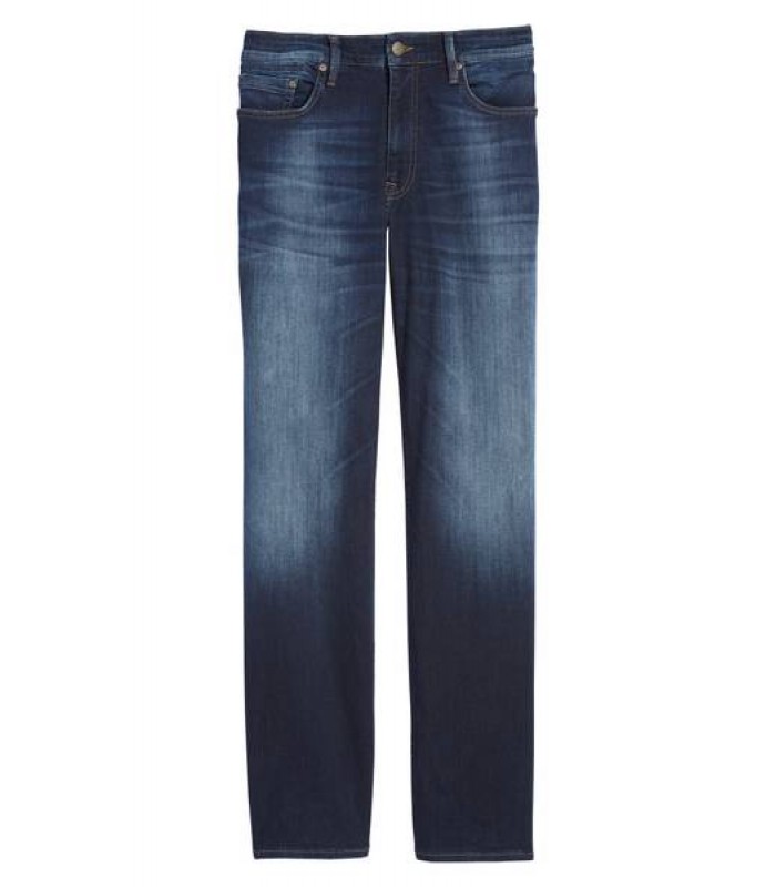 Luminously sanded highlights characterize the dark blue denim of generously cut, relaxed-fit jeans. Raised stitching brands the back pockets.